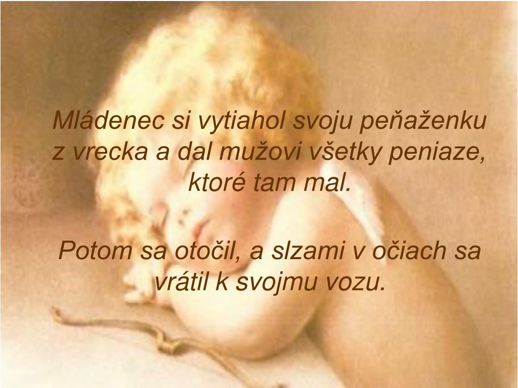 Mládenec si vytiahol svoju peňaženku z vrecka a dal mužovi všetky peniaze, ktoré tam mal. Potom sa otočil, a slzami v očiach sa vrátil k svojmu vozu.