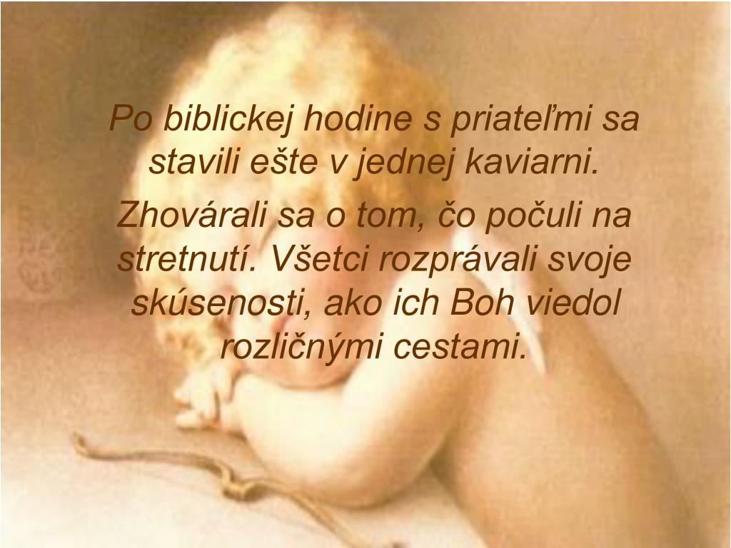 Po biblickej hodine s priateľmi sa stavili ešte v jednej kaviarni. Zhovárali sa o tom, čo počuli na stretnutí. Všetci rozprávali svoje skúsenosti, ako ich Boh viedol rozličnými cestami.