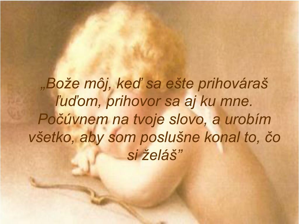 „Bože môj, keď sa ešte prihováraš ľuďom, prihovor sa aj ku mne. Počúvnem na tvoje slovo, a urobím všetko, aby som poslušne konal to, čo si želáš”