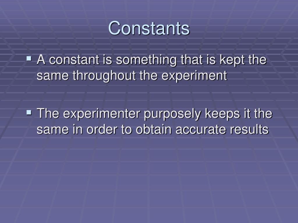 Constants • A constant is something that is kept the same throughout the experiment • The experimenter purposely keeps it the same in order to obtain accurate results