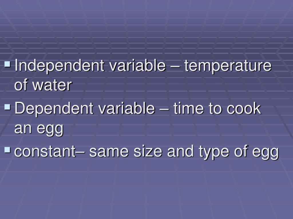 Independent variable – temperature of water • Dependent variable – time to cook an egg • constant– same size and type of egg