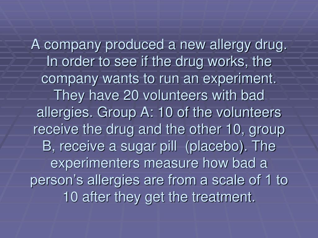 A company produced a new allergy drug. In order to see if the drug works, the company wants to run an experiment. They have 20 volunteers with bad allergies. Group A: 10 of the volunteers receive the drug and the other 10, group B, receive a sugar pill (placebo). The experimenters measure how bad a person’s allergies are from a scale of 1 to 10 after they get the treatment.