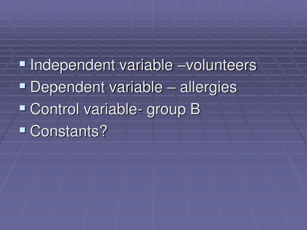 Independent variable –volunteers • Dependent variable – allergies • Control variable- group B • Constants?