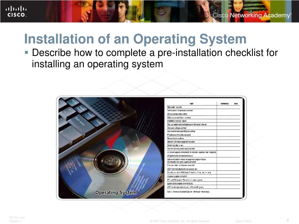 Installation of an Operating System • Describe how to complete a pre-installation checklist for installing an operating system