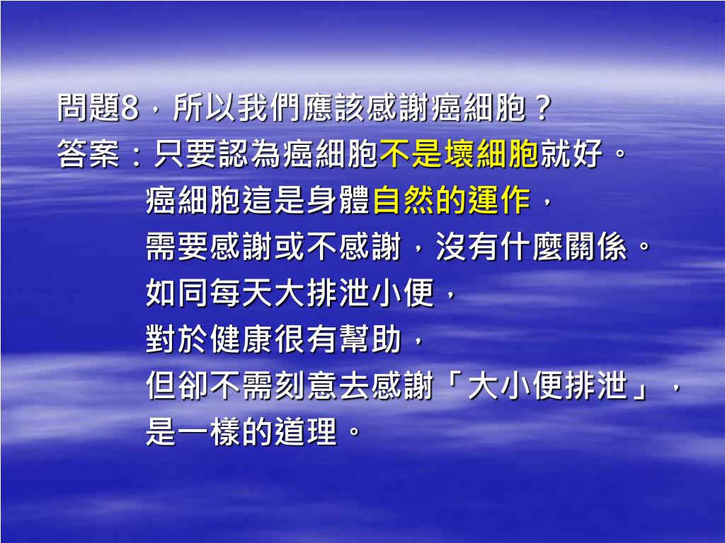 問題8,所以我們應該感謝癌細胞? 答案:只要認為癌細胞不是壞細胞就好。 癌細胞這是身體自然的運作, 需要感謝或不感謝,沒有什麼關係。 如同每天大排泄小便, 對於健康很有幫助, 但卻不需刻意去感謝「大小便排泄」, 是一樣的道理。