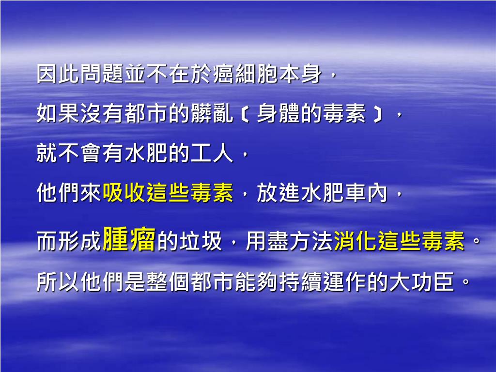 問題13:「開刀」治療,將毒素也一起拿掉, 為何不好? 答:癌細胞就像是一群水肥工人, 他們每天蒐集水肥、 處理水肥, 並將水肥車放在某個地方且在那裡休息, 雖然他們又髒又臭,但不是他們的錯! 而是這個都市本身已變得又髒又亂, 所以需要他們來協助清理! 癌症也是如此。