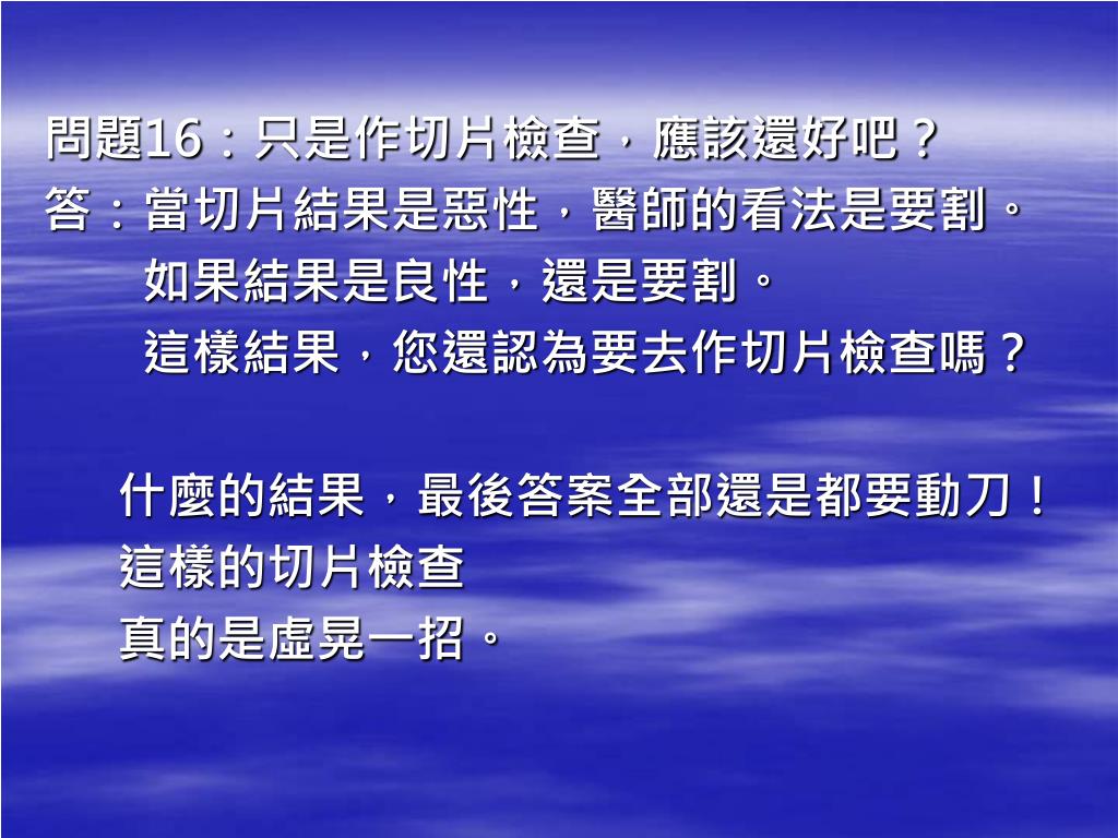 問題16:只是作切片檢查,應該還好吧? 答:當切片結果是惡性,醫師的看法是要割。 如果結果是良性,還是要割。 這樣結果,您還認為要去作切片檢查嗎? 什麼的結果,最後答案全部還是都要動刀! 這樣的切片檢查 真的是虛晃一招。