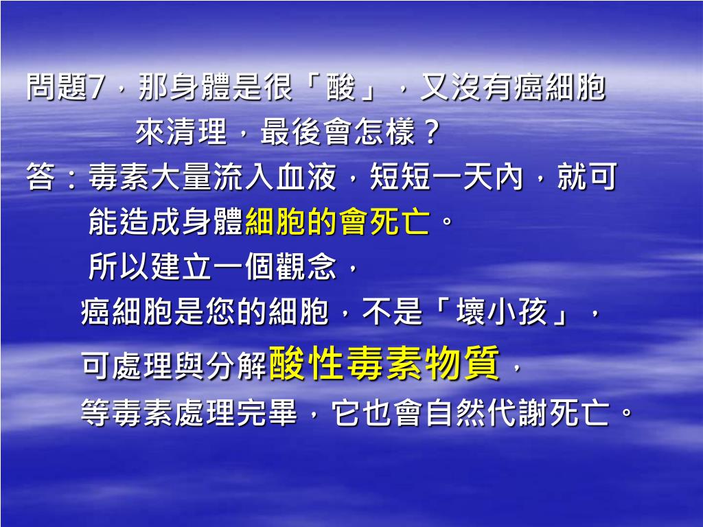 問題7,那身體是很「酸」,又沒有癌細胞 來清理,最後會怎樣? 答:毒素大量流入血液,短短一天內,就可 能造成身體細胞的會死亡。 所以建立一個觀念, 癌細胞是您的細胞,不是「壞小孩」, 可處理與分解酸性毒素物質, 等毒素處理完畢,它也會自然代謝死亡。