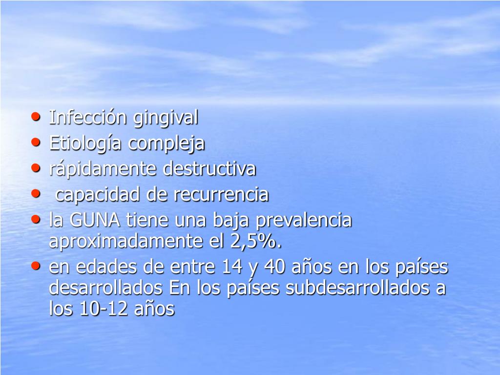 Infección gingival • Etiología compleja • rápidamente destructiva • capacidad de recurrencia • la GUNA tiene una baja prevalencia aproximadamente el 2,5%. • en edades de entre 14 y 40 años en los países desarrollados En los países subdesarrollados a los 10-12 años