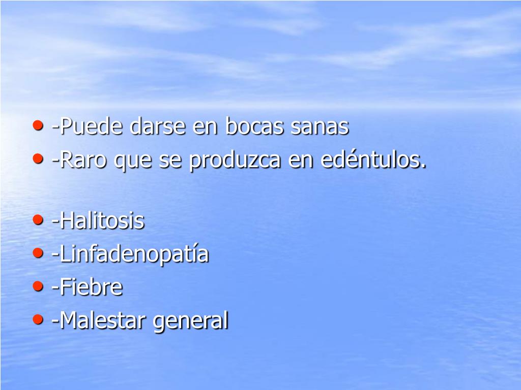 -Puede darse en bocas sanas • -Raro que se produzca en edéntulos. • -Halitosis • -Linfadenopatía • -Fiebre • -Malestar general