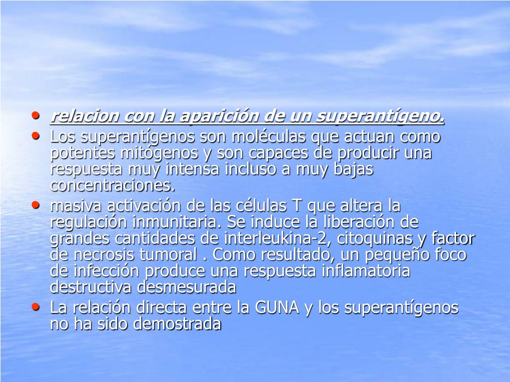 relacion con la aparición de un superantígeno. • Los superantígenos son moléculas que actuan como potentes mitógenos y son capaces de producir una respuesta muy intensa incluso a muy bajas concentraciones. • masiva activación de las células T que altera la regulación inmunitaria. Se induce la liberación de grandes cantidades de interleukina-2, citoquinas y factor de necrosis tumoral . Como resultado, un pequeño foco de infección produce una respuesta inflamatoria destructiva desmesurada • La relación directa entre la GUNA y los superantígenos no ha sido demostrada
