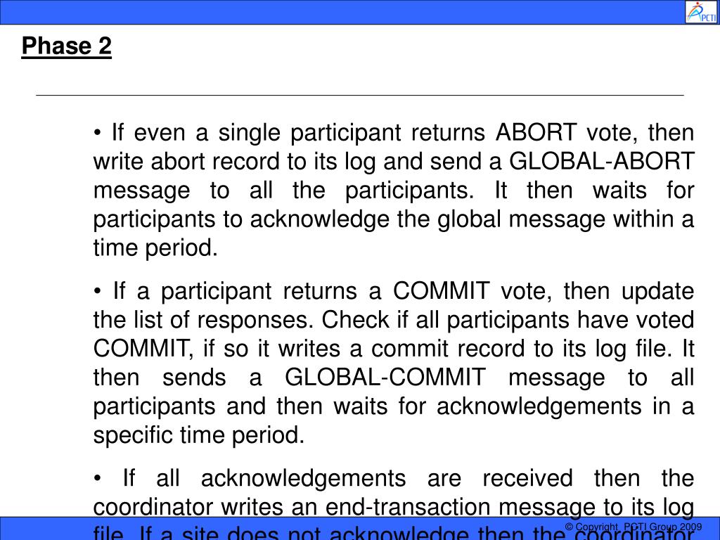 Phase 2 • If even a single participant returns ABORT vote, then write abort record to its log and send a GLOBAL-ABORT message to all the participants. It then waits for participants to acknowledge the global message within a time period. • If a participant returns a COMMIT vote, then update the list of responses. Check if all participants have voted COMMIT, if so it writes a commit record to its log file. It then sends a GLOBAL-COMMIT message to all participants and then waits for acknowledgements in a specific time period. • If all acknowledgements are received then the coordinator writes an end-transaction message to its log file. If a site does not acknowledge then the coordinator re-sends the global decision until an acknowledgement is received.