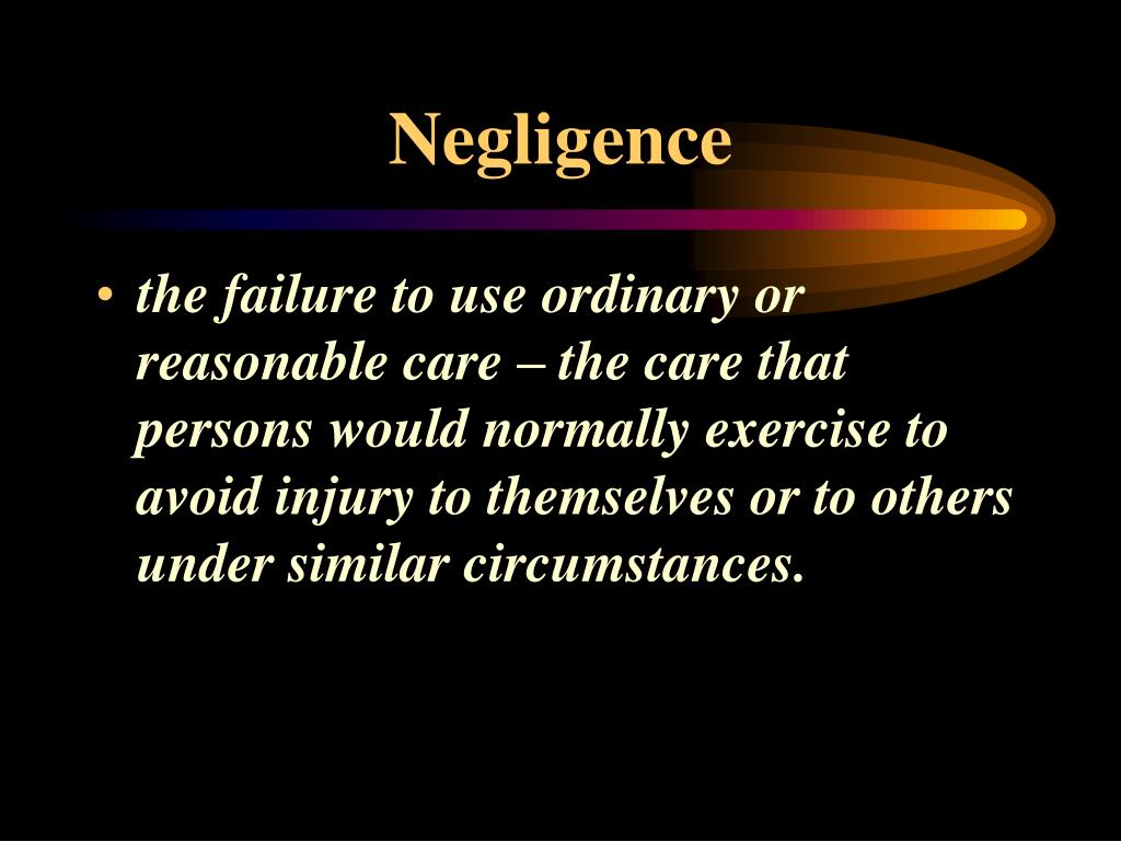 Negligence • the failure to use ordinary or reasonable care – the care that persons would normally exercise to avoid injury to themselves or to others under similar circumstances.
