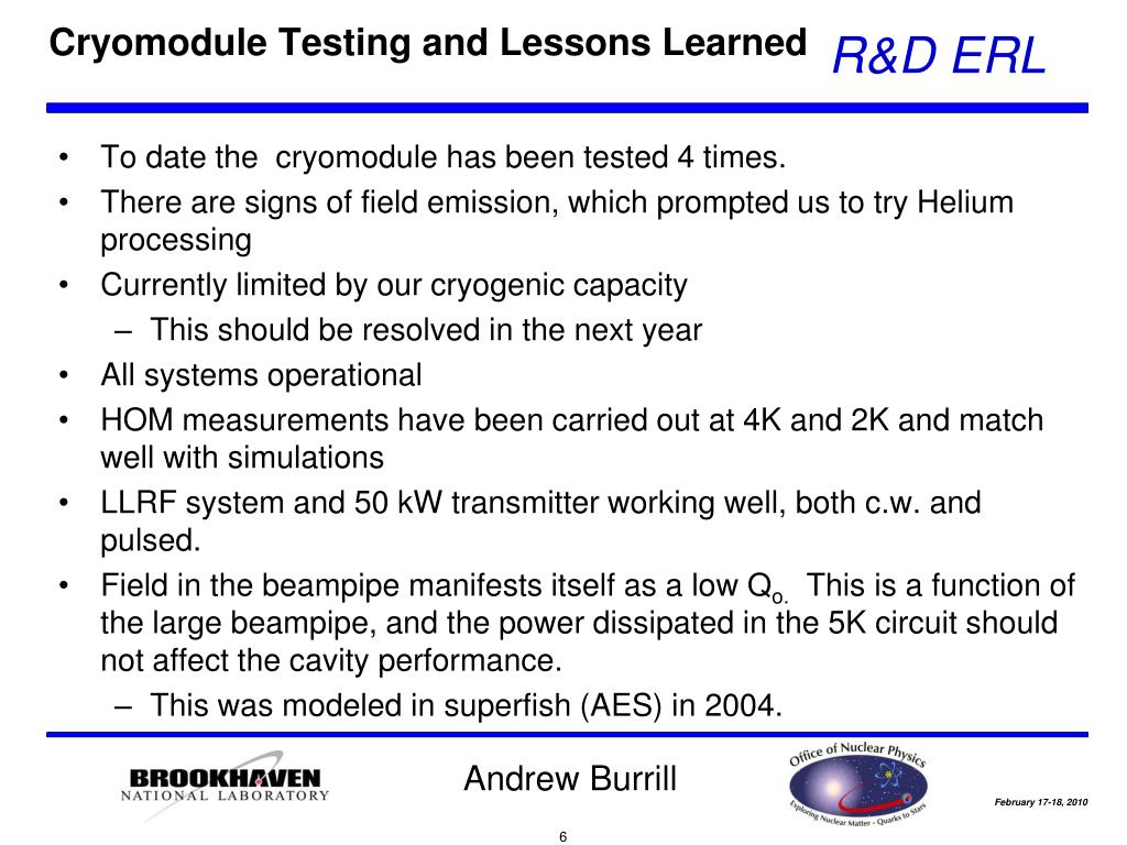Cryomodule Testing and Lessons Learned • To date the cryomodule has been tested 4 times. • There are signs of field emission, which prompted us to try Helium processing • Currently limited by our cryogenic capacity • This should be resolved in the next year • All systems operational • HOM measurements have been carried out at 4K and 2K and match well with simulations • LLRF system and 50 kW transmitter working well, both c.w. and pulsed. • Field in the beampipe manifests itself as a low Qo. This is a function of the large beampipe, and the power dissipated in the 5K circuit should not affect the cavity performance. • This was modeled in superfish (AES) in 2004.