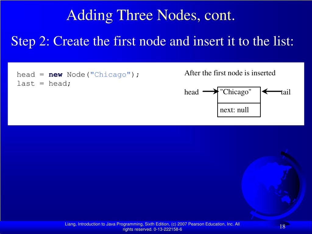 Adding Three Nodes The variable head refers to the first node in the list, and the variable last refers to the last node in the list. If the list is empty, both are null. For example, you can create three nodes to store three strings in a list, as follows: Step 1: Declare head and tail: