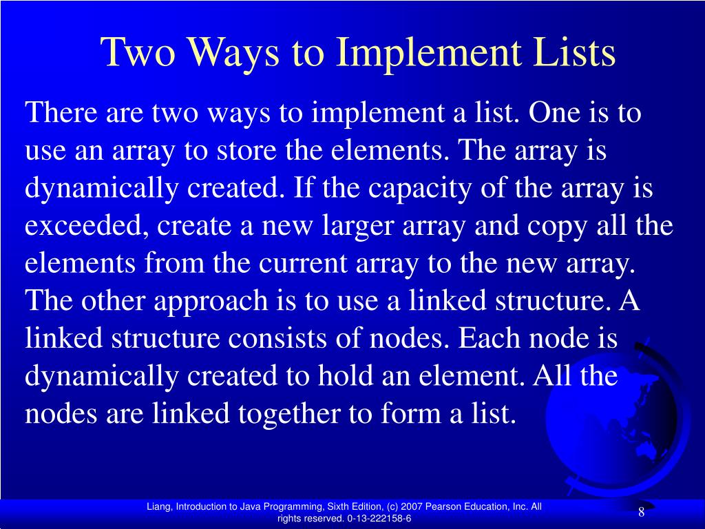 Two Ways to Implement Lists There are two ways to implement a list. One is to use an array to store the elements. The array is dynamically created. If the capacity of the array is exceeded, create a new larger array and copy all the elements from the current array to the new array. The other approach is to use a linked structure. A linked structure consists of nodes. Each node is dynamically created to hold an element. All the nodes are linked together to form a list.