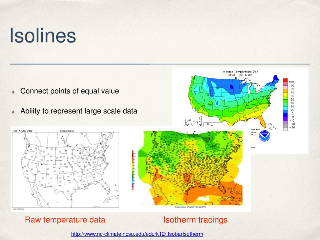 Isolines • Connect points of equal value • Ability to represent large scale data Raw temperature data Isotherm tracings http://www.nc-climate.ncsu.edu/edu/k12/.IsobarIsotherm
