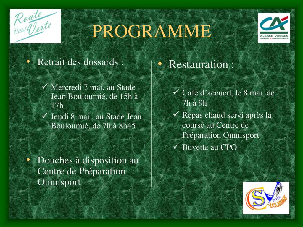 INFORMATIONS • La sécurité médicale est assurée par un médecin, une ambulance et la Croix Rouge. • Tous les carrefours seront sécurisés par des signaleurs. • Pour la GRV, un classement par âge sera établit. • Un trophée « CREDIT AGRICOLE » du meilleur grimpeur est proposé, classement des 5 premiers sur 4 côtes pour la GRV et 2 côtes pour la PRV. • Un caméraman professionnel sera présent sur la course et proposera son film à la vente. • Après l’arrivée, au CPO, chaque participant échangera son dossard contre un ticket-repas. Sur présentation de ce dernier un repas chaud sera servi. • Un tirage au sort vous permettra, peut-être de remporter de nombreux lots et un tee-shirt vous sera généreusement offert. • Les remises des prix se dérouleront, après et dans le même local que les repas. • Les classements seront envoyés à chaque coureur si celui-ci a donné son e-mail, et seront consultables le soir même sur notre site : http://www.csvittel.fr • Contacts : • Gérard THOUVENOT au 03.29.36.66.35 • Arnaud CHATELAIN au 03.29.08.50.10 ou contact@csvittel.fr • Site internet du Club : http://www.csvittel.fr/http://www.csvittel.fr/ • Hébergement : Renseignement auprès de l’Office du Tourisme de Vittel au 03.29.08.08.88 ou http://www.vitteltourisme.com/