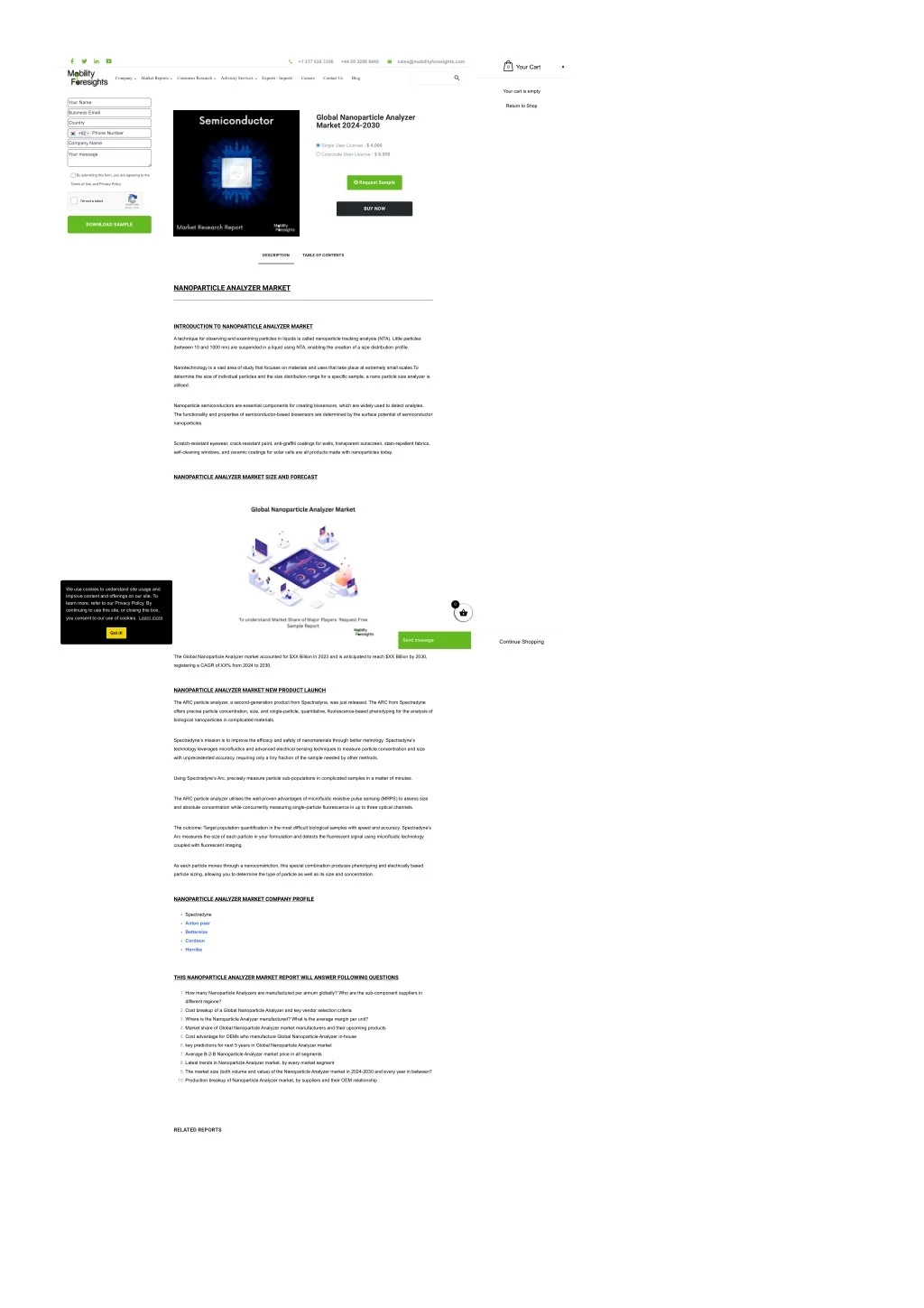 +1 217 636 3356 +44 20 3289 9440 sales@mobilityforesights.com Your Cart 0 Company Market Reports Consumer Research Advisory Services Exports - Imports Careers Contact Us Blog Your cart is empty Your Name Return to Shop Business Email Global Nanoparticle Analyzer Market 2024-2030 Country Phone Number +82 Company Name Single User License : $ 4,000 Your message Corporate User License : $ 6,000 By submitting this form, you are agreeing to the Request Sample Terms of Use and Privacy Policy. I'm not a robot reCAPTCHA Privacy - Terms BUY NOW DOWNLOAD SAMPLE DESCRIPTION TABLE OF CONTENTS NANOPARTICLE ANALYZER MARKET INTRODUCTION TO NANOPARTICLE ANALYZER MARKET A technique for observing and examining particles in liquids is called nanoparticle tracking analysis (NTA). Little particles (between 10 and 1000 nm) are suspended in a liquid using NTA, enabling the creation of a size distribution profile. Nanotechnology is a vast area of study that focuses on materials and uses that take place at extremely small scales.To determine the size of individual particles and the size distribution range for a specific sample, a nano particle size analyzer is utilised. Nanoparticle semiconductors are essential components for creating biosensors, which are widely used to detect analytes. The functionality and properties of semiconductor-based biosensors are determined by the surface potential of semiconductor nanoparticles. Scratch-resistant eyewear, crack-resistant paint, anti-graffiti coatings for walls, transparent sunscreen, stain-repellent fabrics, self-cleaning windows, and ceramic coatings for solar cells are all products made with nanoparticles today. NANOPARTICLE ANALYZER MARKET SIZE AND FORECAST We use cookies to understand site usage and improve content and offerings on our site. To learn more, refer to our Privacy Policy. By continuing to use this site, or closing this box, 0 Learn more you consent to our use of cookies. Got it! Send message Continue Shopping The Global Nanoparticle Analyzer market accounted for $XX Billion in 2023 and is anticipated to reach $XX Billion by 2030, registering a CAGR of XX% from 2024 to 2030. NANOPARTICLE ANALYZER MARKET NEW PRODUCT LAUNCH The ARC particle analyzer, a second-generation product from Spectradyne, was just released. The ARC from Spectradyne offers precise particle concentration, size, and single-particle, quantitative, fluorescence-based phenotyping for the analysis of biological nanoparticles in complicated materials. Spectradyne’s mission is to improve the efficacy and safety of nanomaterials through better metrology. Spectradyne’s technology leverages microfluidics and advanced electrical sensing techniques to measure particle concentration and size with unprecedented accuracy, requiring only a tiny fraction of the sample needed by other methods. Using Spectradyne’s Arc, precisely measure particle sub-populations in complicated samples in a matter of minutes. The ARC particle analyzer utilises the well-proven advantages of microfluidic resistive pulse sensing (MRPS) to assess size and absolute concentration while concurrently measuring single-particle fluorescence in up to three optical channels. The outcome: Target population quantification in the most difficult biological samples with speed and accuracy. Spectradyne’s Arc measures the size of each particle in your formulation and detects the fluorescent signal using microfluidic technology coupled with fluorescent imaging. As each particle moves through a nanoconstriction, this special combination produces phenotyping and electrically based particle sizing, allowing you to determine the type of particle as well as its size and concentration. NANOPARTICLE ANALYZER MARKET COMPANY PROFILE Spectradyne Anton paar Bettersize Cordoun Horriba THIS NANOPARTICLE ANALYZER MARKET REPORT WILL ANSWER FOLLOWING QUESTIONS 1. How many Nanoparticle Analyzers are manufactured per annum globally? Who are the sub-component suppliers in different regions? 2. Cost breakup of a Global Nanoparticle Analyzer and key vendor selection criteria 3. Where is the Nanoparticle Analyzer manufactured? What is the average margin per unit? 4. Market share of Global Nanoparticle Analyzer market manufacturers and their upcoming products 5. Cost advantage for OEMs who manufacture Global Nanoparticle Analyzer in-house 6. key predictions for next 5 years in Global Nanoparticle Analyzer market 7. Average B-2-B Nanoparticle Analyzer market price in all segments 8. Latest trends in Nanoparticle Analyzer market, by every market segment 9. The market size (both volume and value) of the Nanoparticle Analyzer market in 2024-2030 and every year in between? 10. Production breakup of Nanoparticle Analyzer market, by suppliers and their OEM relationship RELATED REPORTS