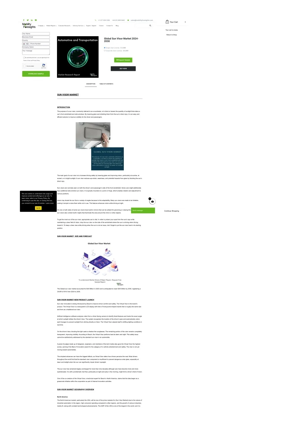 +1 217 636 3356 +44 20 3289 9440 sales@mobilityforesights.com Your Cart 0 Company Market Reports Consumer Research Advisory Services Exports - Imports Careers Contact Us Blog Your cart is empty Your Name Return to Shop Business Email Global Sun Visor Market 2024- 2030 Country Phone Number +82 Company Name Single User License : $ 3,500 Your message Corporate User License : $ 6,000 By submitting this form, you are agreeing to the Request Sample Terms of Use and Privacy Policy. I'm not a robot reCAPTCHA Privacy - Terms BUY NOW DOWNLOAD SAMPLE DESCRIPTION TABLE OF CONTENTS SUN VISOR MARKET INTRODUCTION The purpose of a sun visor, commonly referred to as a sunshade, is to block or lessen the quantity of sunlight that enters a car’s front windshield and side windows. By lowering glare and shielding them from the sun’s direct rays, it is an easy and efficient solution to improve visibility for the driver and passengers. The main goal of a sun visor is to increase driving safety by lowering glare and improving vision, particularly at sunrise, at sunset, or in bright sunlight. A sun visor reduces eye strain, weariness, and potential hazards from glare by blocking the sun’s direct rays. Sun visors are normally seen on both the driver’s and passenger’s side of the front windshield. Some cars might additionally have additional side window sun visors. It is typically mounted on a pivot or hinge, which enables rotation and adjustment to We use cookies to understand site usage and improve content and offerings on our site. To learn more, refer to our Privacy Policy. By continuing to use this site, or closing this box, various positions. 0 Users may shade the sun from a variety of angles because to this adaptability. Many sun visors are made to be foldable, Learn more you consent to our use of cookies. making it simple to store them while not in use. This feature enhances vision while driving at night. Got it! On one or both sides of some sun visors have built-in mirrors that can be utilized for grooming or viewing the rearview. Some Send message Continue Shopping sun visors also contain built-in lights that illuminate the area around the mirror or other objects. To get the most out of the sun visor, appropriate use is vital. In order to protect your eyes from the sun’s rays while maintaining a clear field of vision, drop the sun visor on the side of the windshield where the sun is shining when driving toward it. To keep a clear view while driving when the sun is not an issue, don’t forget to put the sun visor back in its starting position. SUN VISOR MARKET SIZE AND FORECAST The Global sun visor market accounted for $XX Billion in 2023 and is anticipated to reach $XX Billion by 2030, registering a CAGR of XX% from 2024 to 2030. SUN VISOR MARKET NEW PRODUCT LAUNCH Sun visor innovation is being introduced by Bosch to improve driver comfort and safety. The Virtual Visor is the brand’s product. The Virtual Visor is a transparent LCD display with lines of honeycomb-shaped inserts that is roughly the same size and form as a traditional sun visor. Artificial intelligence software analyzes video from a driver-facing camera to identify facial features and tracks the exact angle at which sunlight strikes the driver’s face. The system recognizes the location of the driver’s eyes and automatically colors each hexagon to prevent sunlight from shining directly on them. The Virtual Visor adjusts itself to shifting lighting conditions in real time. On the driver’s face, blocking the light casts a shadow like sunglasses. The remaining portion of the visor remains completely transparent, improving visibility. According to Bosch, the Virtual Visor performs best at dawn and night. This safety issue cannot be satisfactorily addressed by the standard sun visor in an automobile. A panel of judges made up of designers, engineers, and members of the tech media also gave the Virtual Visor the highest scores, earning it the Best of Innovation award for the category of in-vehicle entertainment and safety. The visor is not yet moving toward automobiles. The simplest advances can have the biggest effects, as Virtual Visor alters how drivers perceive the road. Most drivers throughout the world find that the standard visor component is insufficient to prevent dangerous solar glare, especially at dawn and twilight when the sun can significantly impair drivers’ eyesight. The sun visor has remained largely unchanged for more than nine decades although cars have become more and more sophisticated. It is still a problematic trait that, particularly at night and early in the morning, might limit a driver’s field of vision. One of the co-creators of the Virtual Visor, a technical expert for Bosch in North America, claims that the idea began as a grassroots initiative within the corporation as part of internal innovation activities. SUN VISOR MARKET GEOGRAPHY OVERVIEW North America The North American market, particularly the USA, will be one of the prime markets for (Sun Visor Market) due to the nature of industrial automation in the region, high consumer spending compared to other regions, and the growth of various industries, mainly AI, along with constant technological advancements. The GDP of the USA is one of the largest in the world, and it is