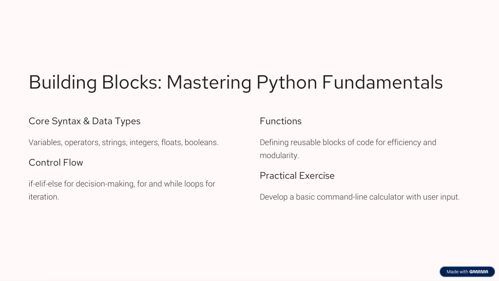 Building Blocks: Mastering Python Fundamentals Core Syntax & Data Types Functions Variables, operators, strings, integers, floats, booleans. Defining reusable blocks of code for efficiency and modularity. Control Flow Practical Exercise if-elif-else for decision-making, for and while loops for iteration. Develop a basic command-line calculator with user input.