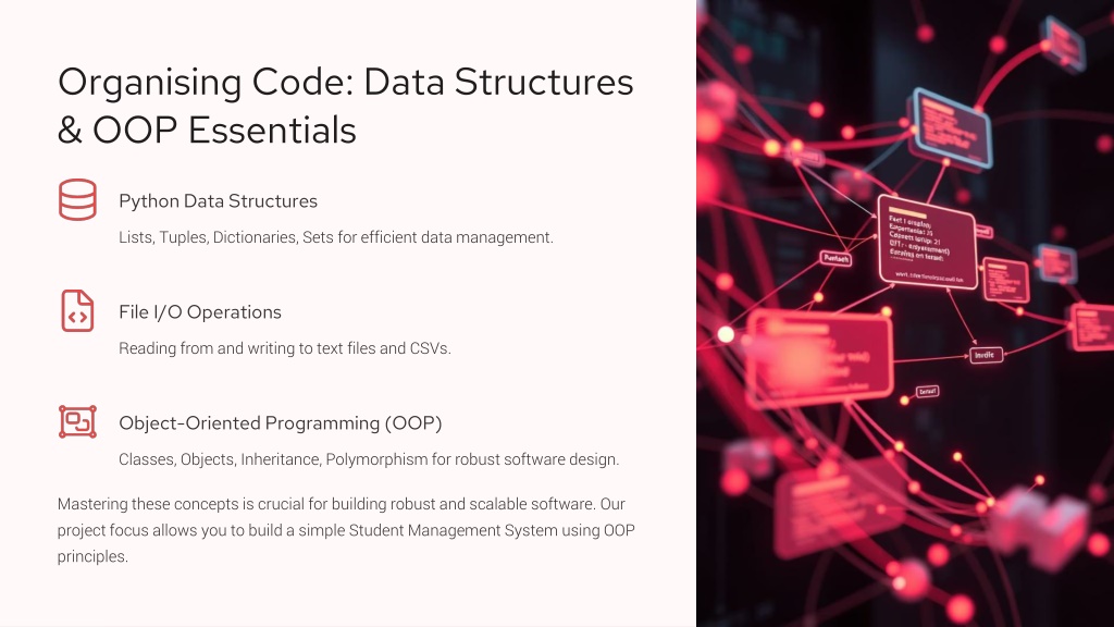 Organising Code: Data Structures & OOP Essentials Python Data Structures Lists, Tuples, Dictionaries, Sets for efficient data management. File I/O Operations Reading from and writing to text files and CSVs. Object-Oriented Programming (OOP) Classes, Objects, Inheritance, Polymorphism for robust software design. Mastering these concepts is crucial for building robust and scalable software. Our project focus allows you to build a simple Student Management System using OOP principles.