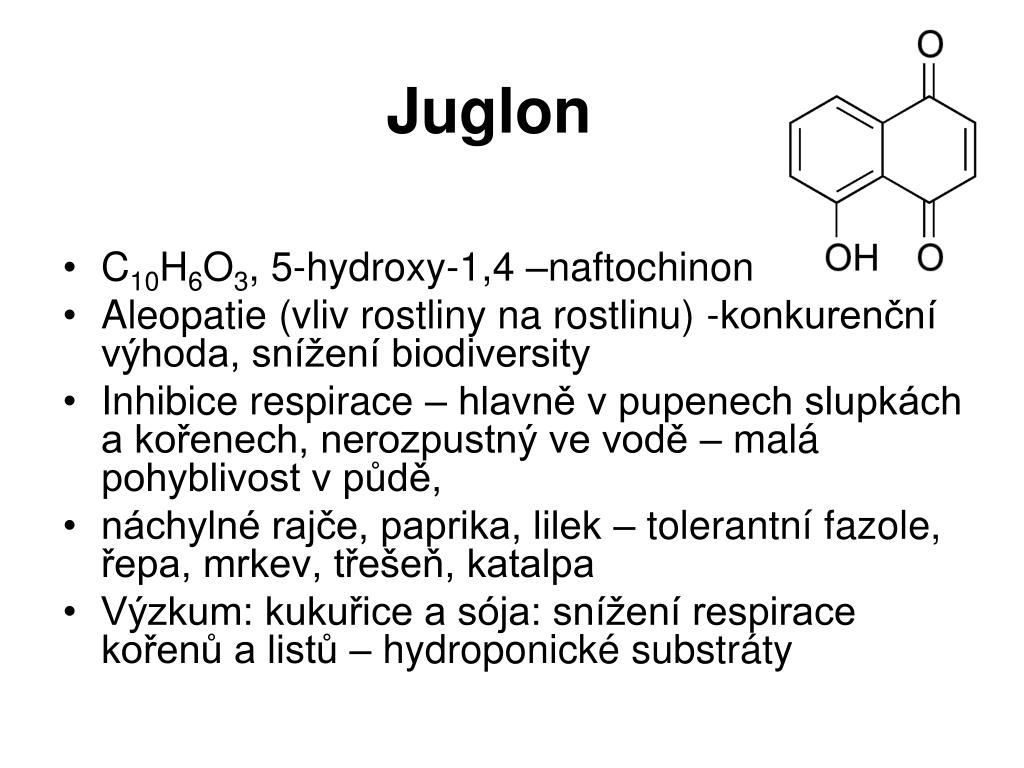 Juglon • C10H6O3, 5-hydroxy-1,4 –naftochinon • Aleopatie (vliv rostliny na rostlinu) -konkurenční výhoda, snížení biodiversity • Inhibice respirace – hlavně v pupenech slupkách a kořenech, nerozpustný ve vodě – malá pohyblivost v půdě, • náchylné rajče, paprika, lilek – tolerantní fazole, řepa, mrkev, třešeň, katalpa • Výzkum: kukuřice a sója: snížení respirace kořenů a listů – hydroponické substráty