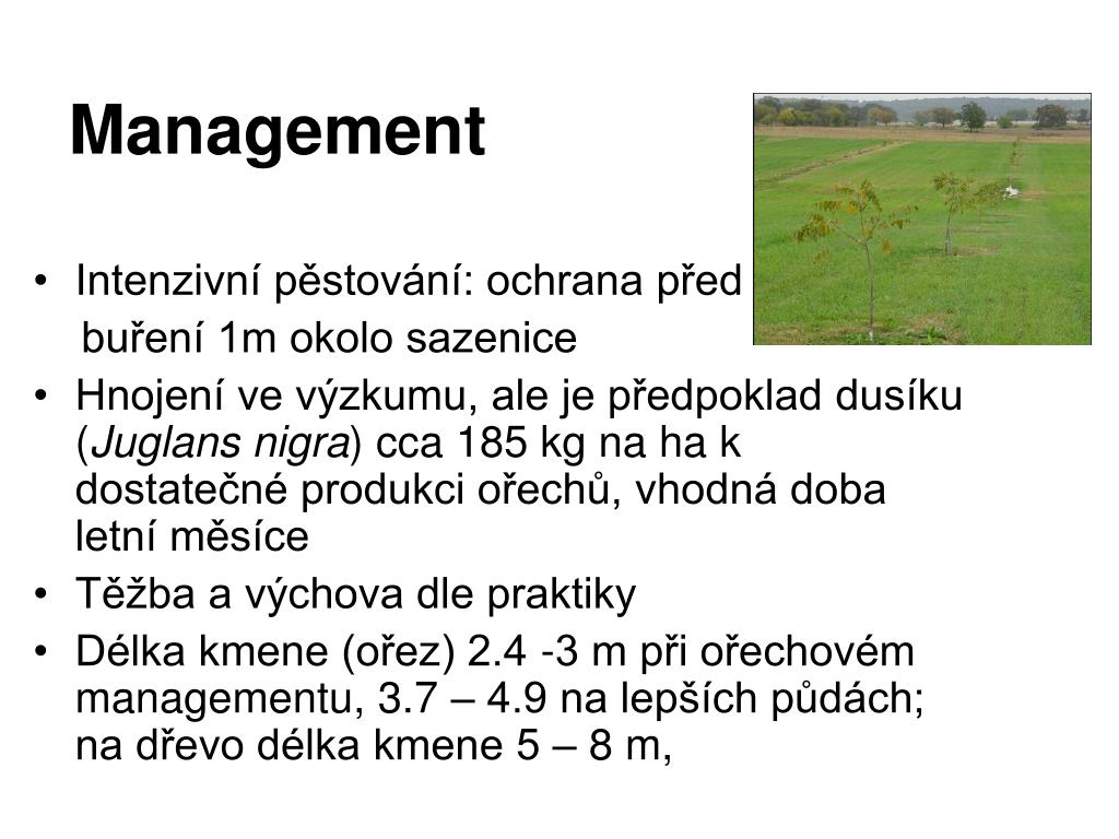 Management • Intenzivní pěstování: ochrana před buření 1m okolo sazenice • Hnojení ve výzkumu, ale je předpoklad dusíku (Juglans nigra) cca 185 kg na ha k dostatečné produkci ořechů, vhodná doba letní měsíce • Těžba a výchova dle praktiky • Délka kmene (ořez) 2.4 -3 m při ořechovém managementu, 3.7 – 4.9 na lepších půdách; na dřevo délka kmene 5 – 8 m,