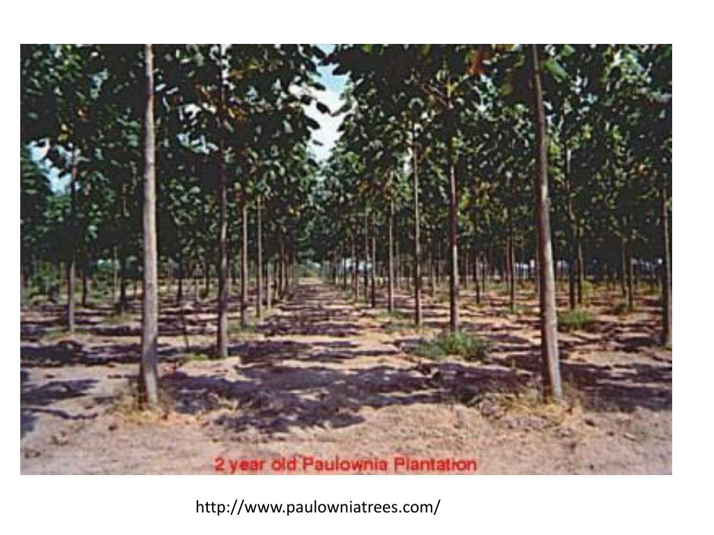 Paulownia trees: • Rychle rostoucí druh: 15 let obmýtí, 2-3 m ročně • Světlomilný druh, 9-21 m výška v dospělosti • Humidní teplé klima 24-30°C • Půdy různé, ale dobře propustné (písek) ne však jíl a kamení, s dostupnou vodou • Srážky 500 – 2 600 mm ročně • Hluboce kořenící druh • Pozdě nasazuje a pozdě shazuje listí, vhodné rozložení listoví • Tvrdé bílé dřevo
