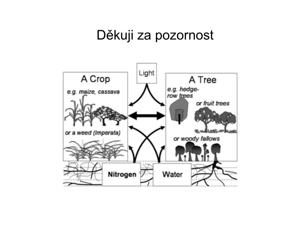 Alley Cropping • Dřevo, eroze, zvyšování produkce… • Pšenice, kukuřice, sója, česnek, fazole, zelenina, vodní meloun….. • Dizajn: řady - dřevo 10 m; dřevo+zem. produkce 10 -15 m, zem plodina 30 - 50 m; v řadě co 5 metrů • Kompetice v období sucha, nebo na nevhod. stanovištích, poblíž řad • Redukce větru 20 -50 % • Nárůst humidity 7 -12 %