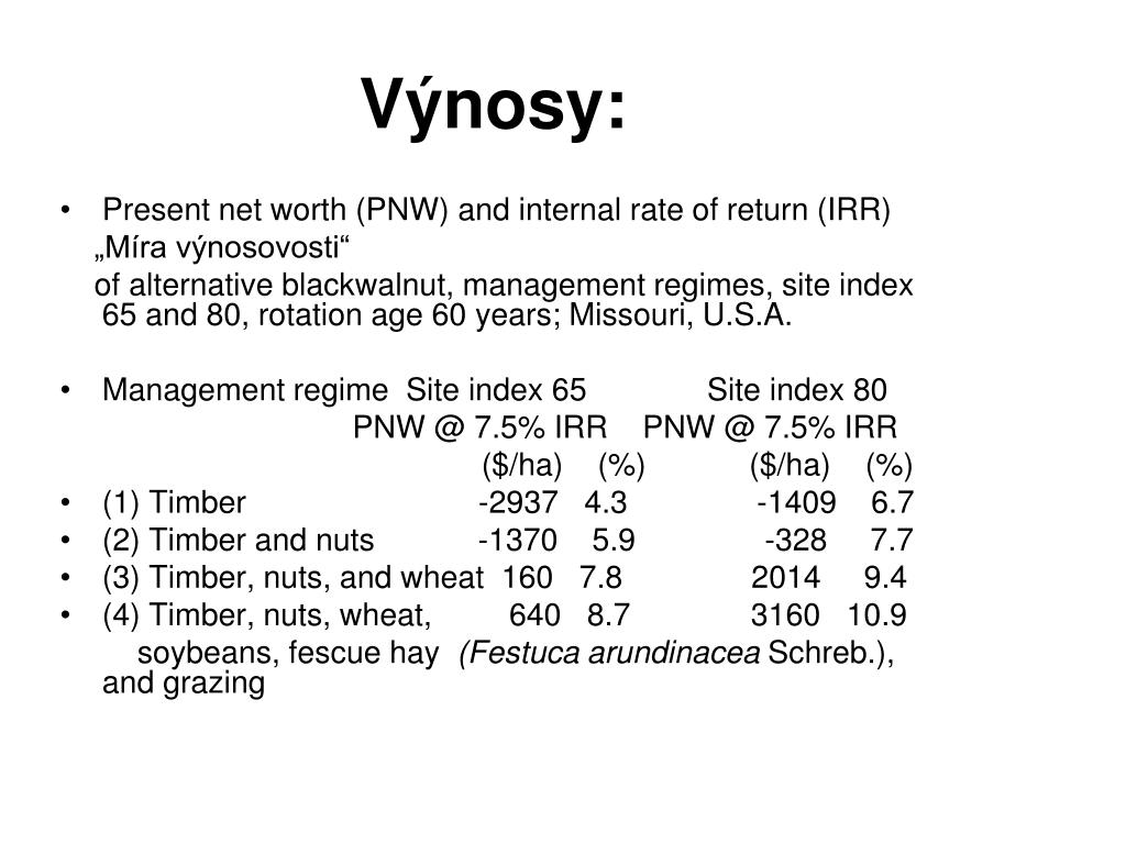 Výnosy: • Present net worth (PNW) and internal rate of return (IRR) „Míra výnosovosti“ of alternative blackwalnut, management regimes, site index 65 and 80, rotation age 60 years; Missouri, U.S.A. • Management regime Site index 65 Site index 80 PNW @ 7.5% IRR PNW @ 7.5% IRR ($/ha) (%) ($/ha) (%) • (1) Timber -2937 4.3 -1409 6.7 • (2) Timber and nuts -1370 5.9 -328 7.7 • (3) Timber, nuts, and wheat 160 7.8 2014 9.4 • (4) Timber, nuts, wheat, 640 8.7 3160 10.9 soybeans, fescue hay (Festuca arundinacea Schreb.), and grazing