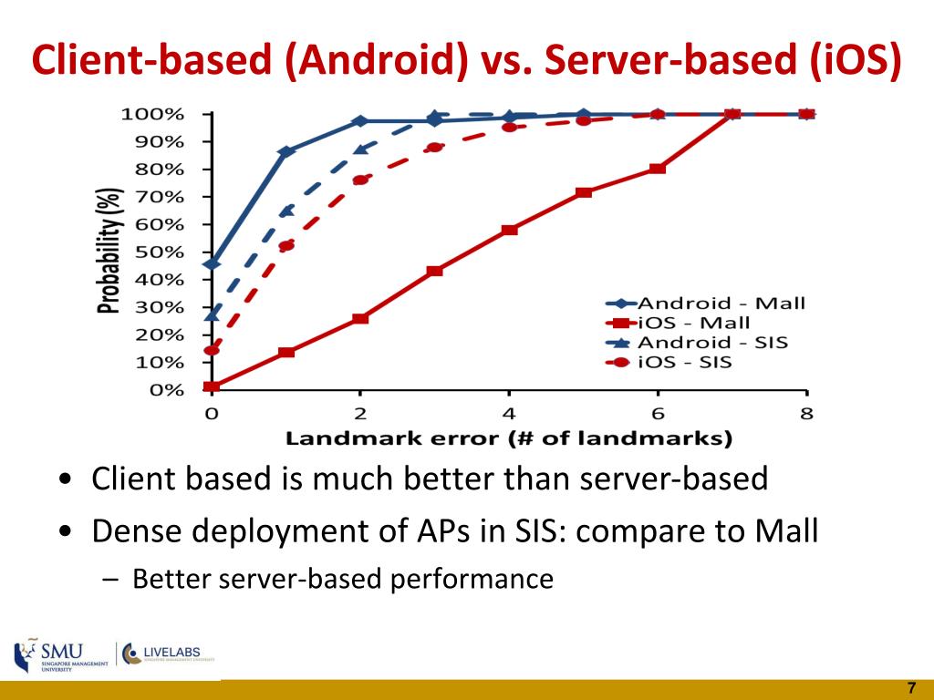 Client-based (Android) vs. Server-based (iOS) • Client based is much better than server-based • Dense deployment of APs in SIS: compare to Mall • Better server-based performance