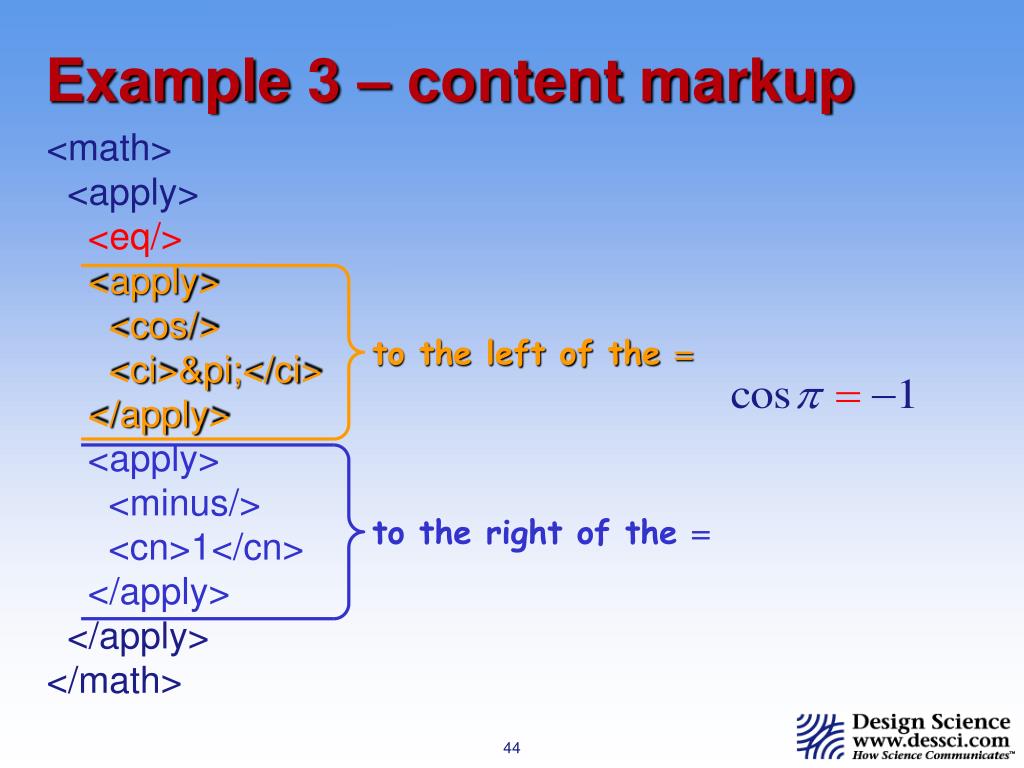 Example 3 – content markup <math> <apply> <eq/><apply> <cos/> <ci>π</ci> </apply> <apply> <minus/> <cn>1</cn> </apply> </apply></math> to the left of the = to the right of the =