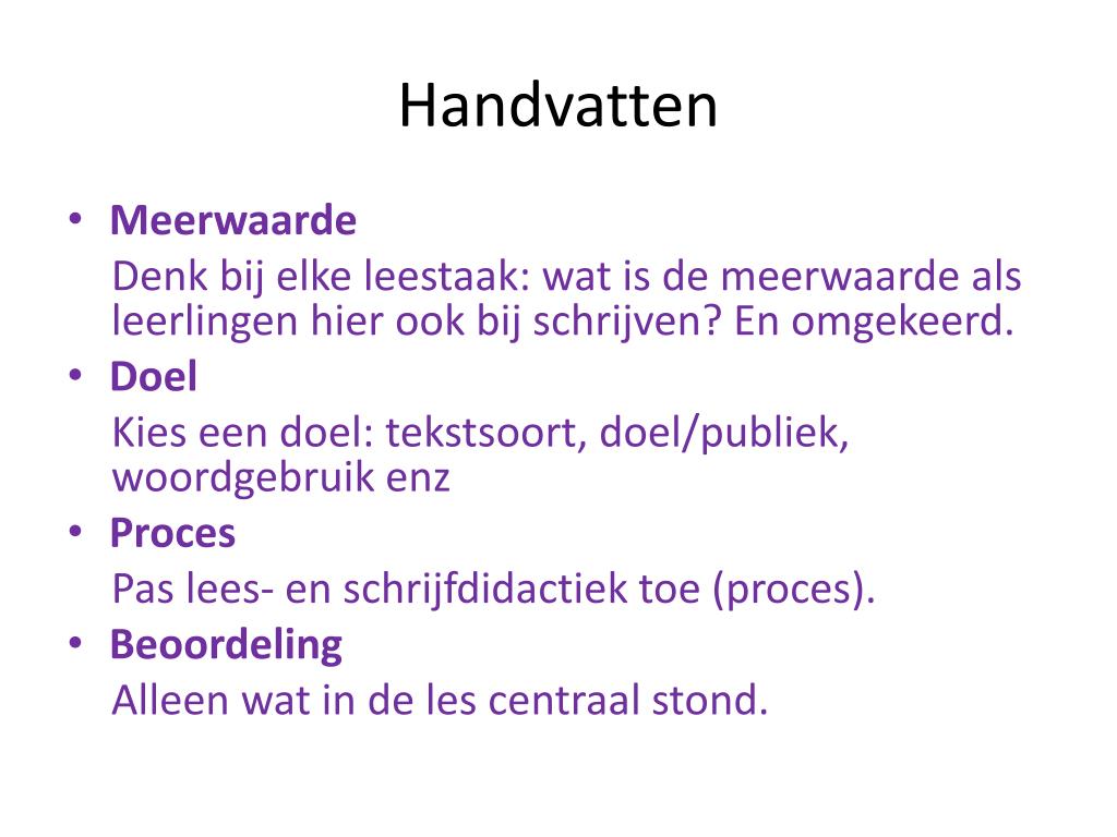 Handvatten • Meerwaarde Denk bij elke leestaak: wat is de meerwaarde als leerlingen hier ook bij schrijven? En omgekeerd. • Doel Kies een doel: tekstsoort, doel/publiek, woordgebruik enz • Proces Pas lees- en schrijfdidactiek toe (proces). • Beoordeling Alleen wat in de les centraal stond.