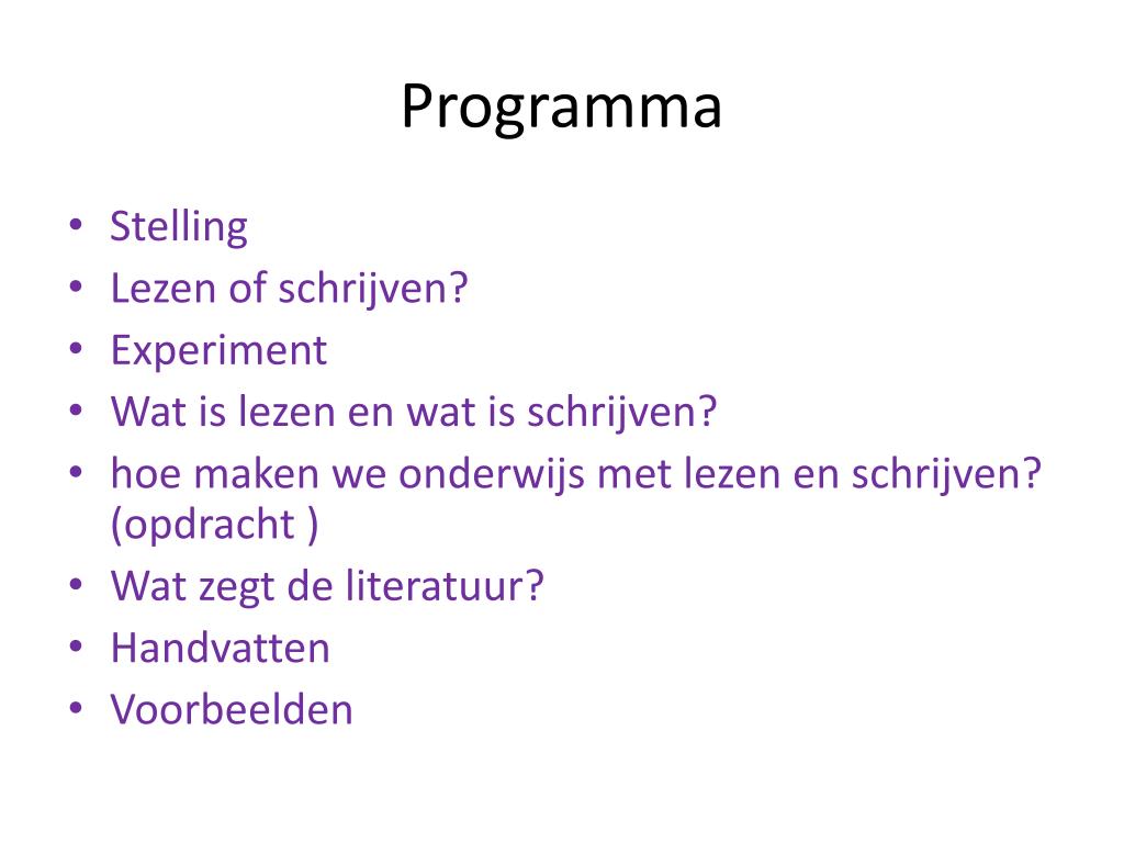 Programma • Stelling • Lezen of schrijven? • Experiment • Wat is lezen en wat is schrijven? • hoe maken we onderwijs met lezen en schrijven? (opdracht ) • Wat zegt de literatuur? • Handvatten • Voorbeelden
