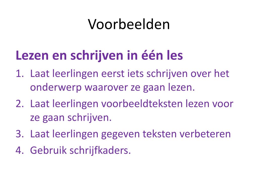 Voorbeelden Lezen en schrijven in één les • Laat leerlingen eerst iets schrijven over het onderwerp waarover ze gaan lezen. • Laat leerlingen voorbeeldteksten lezen voor ze gaan schrijven. • Laat leerlingen gegeven teksten verbeteren • Gebruik schrijfkaders.