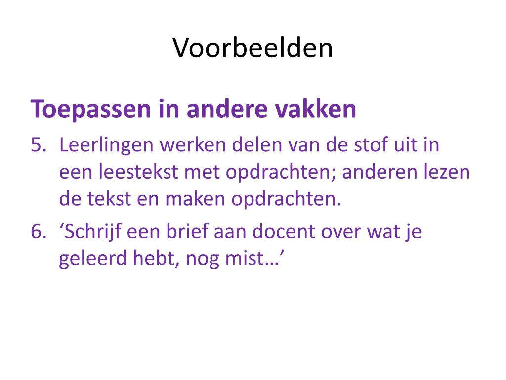 Voorbeelden Toepassen in andere vakken • Leerlingen werken delen van de stof uit in een leestekst met opdrachten; anderen lezen de tekst en maken opdrachten. • ‘Schrijf een brief aan docent over wat je geleerd hebt, nog mist…’