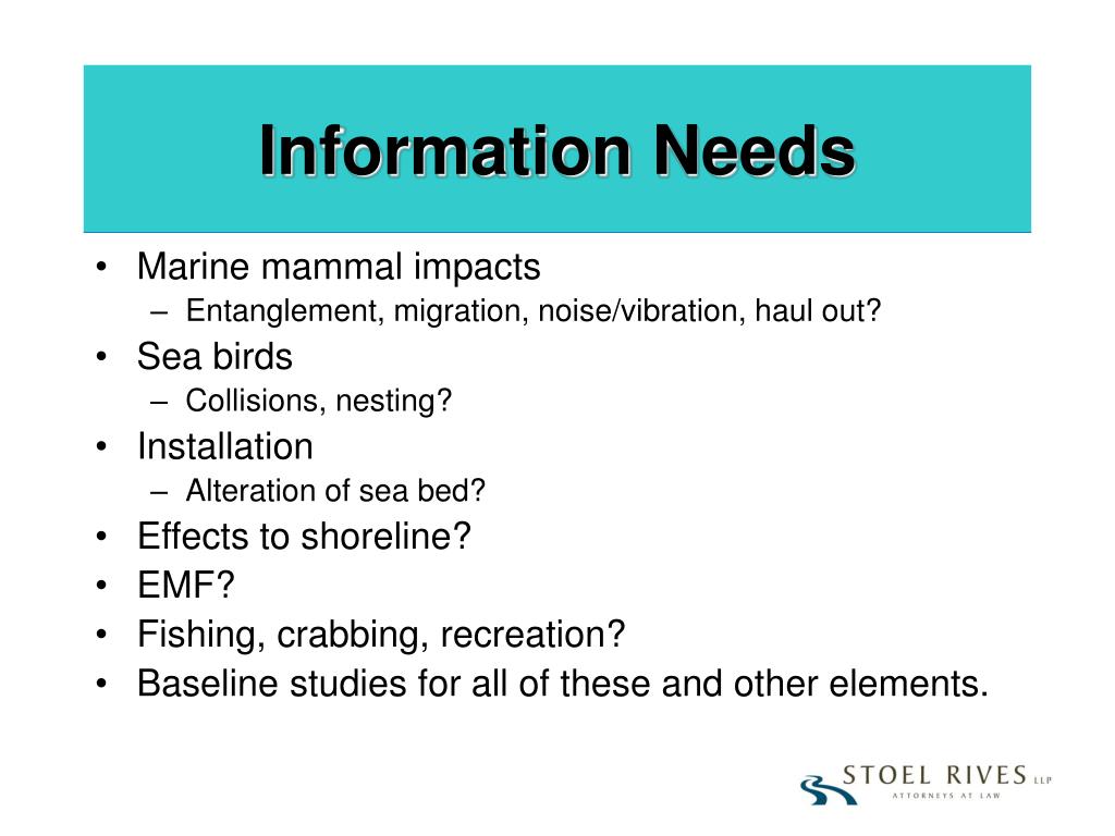Information Needs • Marine mammal impacts • Entanglement, migration, noise/vibration, haul out? • Sea birds • Collisions, nesting? • Installation • Alteration of sea bed? • Effects to shoreline? • EMF? • Fishing, crabbing, recreation? • Baseline studies for all of these and other elements.