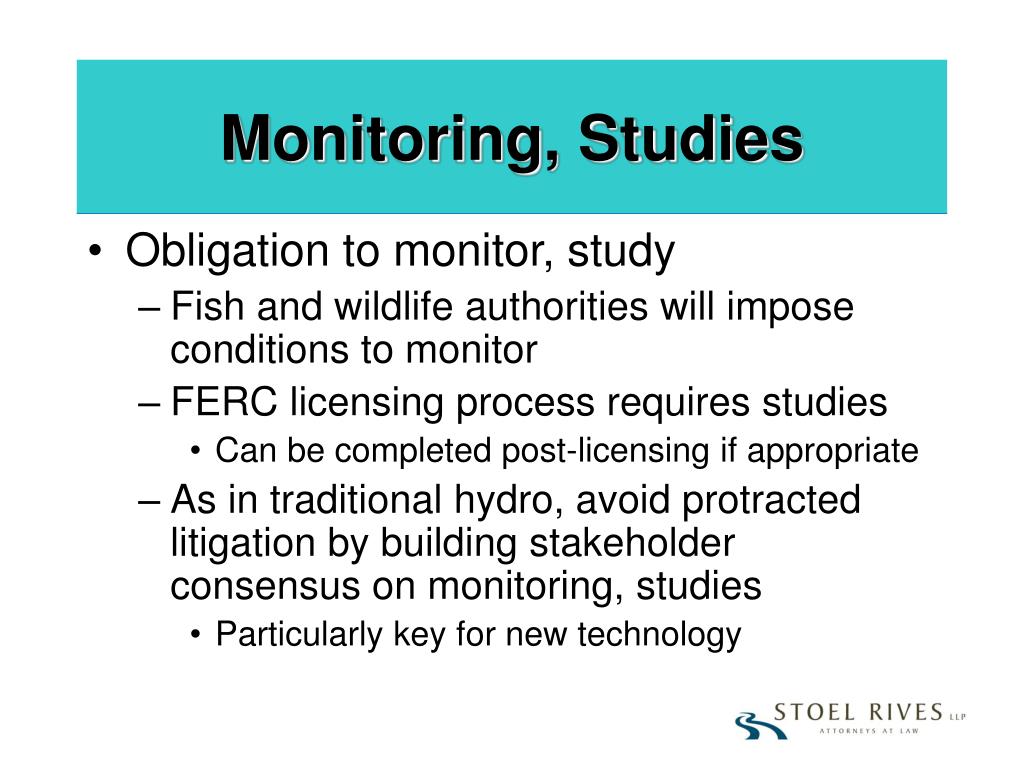 Monitoring, Studies • Obligation to monitor, study • Fish and wildlife authorities will impose conditions to monitor • FERC licensing process requires studies • Can be completed post-licensing if appropriate • As in traditional hydro, avoid protracted litigation by building stakeholder consensus on monitoring, studies • Particularly key for new technology