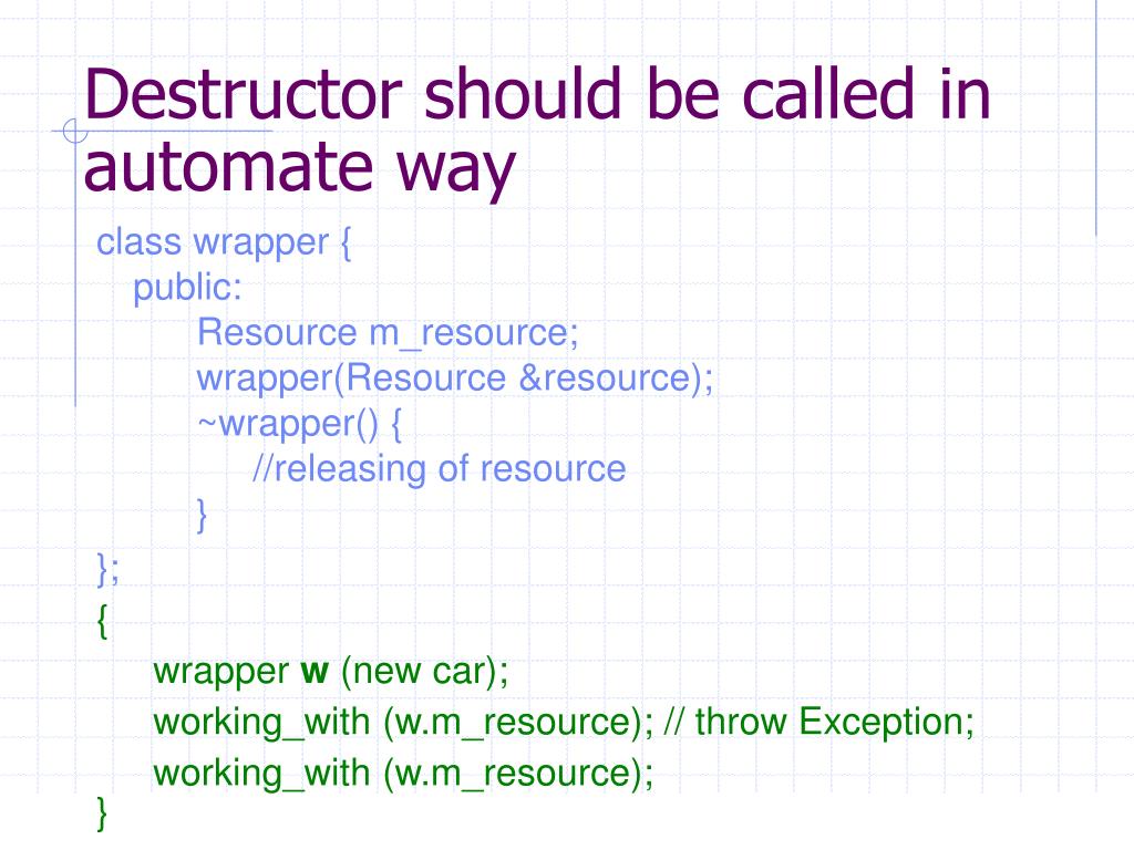 Destructor should be called in automate way class wrapper {public: Resource m_resource; wrapper(Resource &resource); ~wrapper() { //releasing of resource } }; { wrapper w (new car); working_with (w.m_resource); // throw Exception; working_with (w.m_resource); }