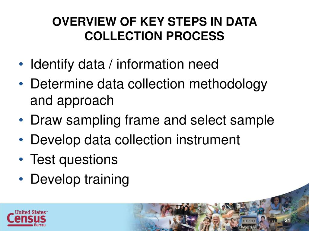 OVERVIEW OF KEY STEPS IN DATA COLLECTION PROCESS • Identify data / information need • Determine data collection methodology and approach • Draw sampling frame and select sample • Develop data collection instrument • Test questions • Develop training