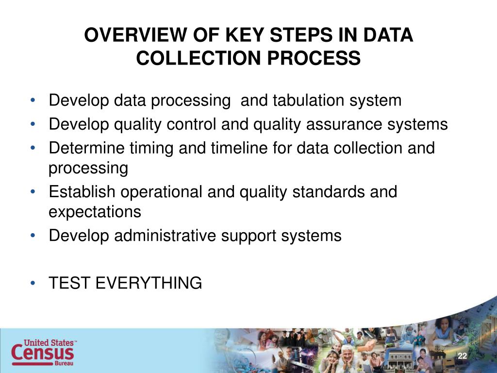 OVERVIEW OF KEY STEPS IN DATA COLLECTION PROCESS • Develop data processing and tabulation system • Develop quality control and quality assurance systems • Determine timing and timeline for data collection and processing • Establish operational and quality standards and expectations • Develop administrative support systems • TEST EVERYTHING