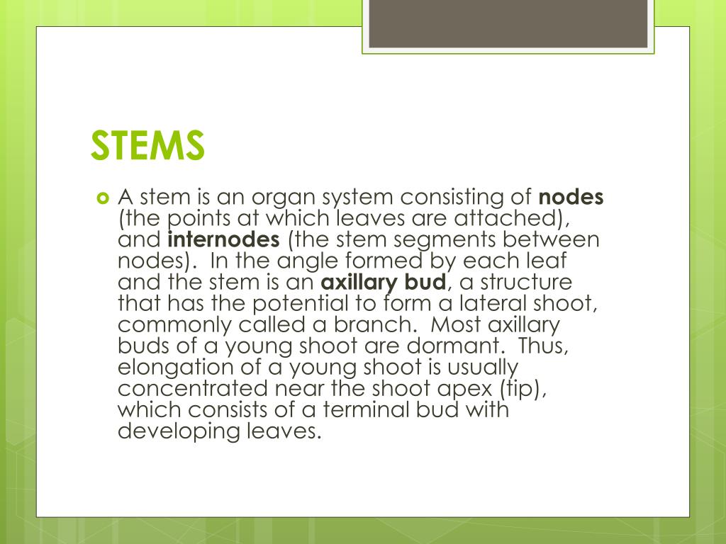 STEMS • A stem is an organ system consisting of nodes (the points at which leaves are attached), and internodes (the stem segments between nodes). In the angle formed by each leaf and the stem is an axillary bud, a structure that has the potential to form a lateral shoot, commonly called a branch. Most axillary buds of a young shoot are dormant. Thus, elongation of a young shoot is usually concentrated near the shoot apex (tip), which consists of a terminal bud with developing leaves.