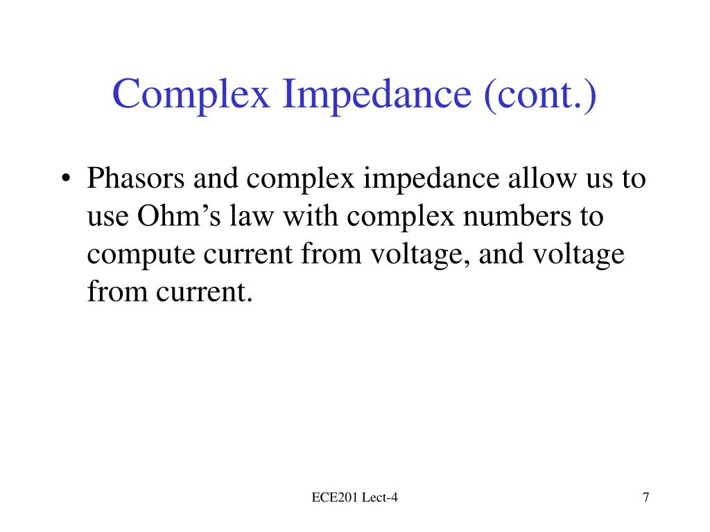 Complex Impedance (cont.) • Phasors and complex impedance allow us to use Ohm’s law with complex numbers to compute current from voltage, and voltage from current. ECE201 Lect-4