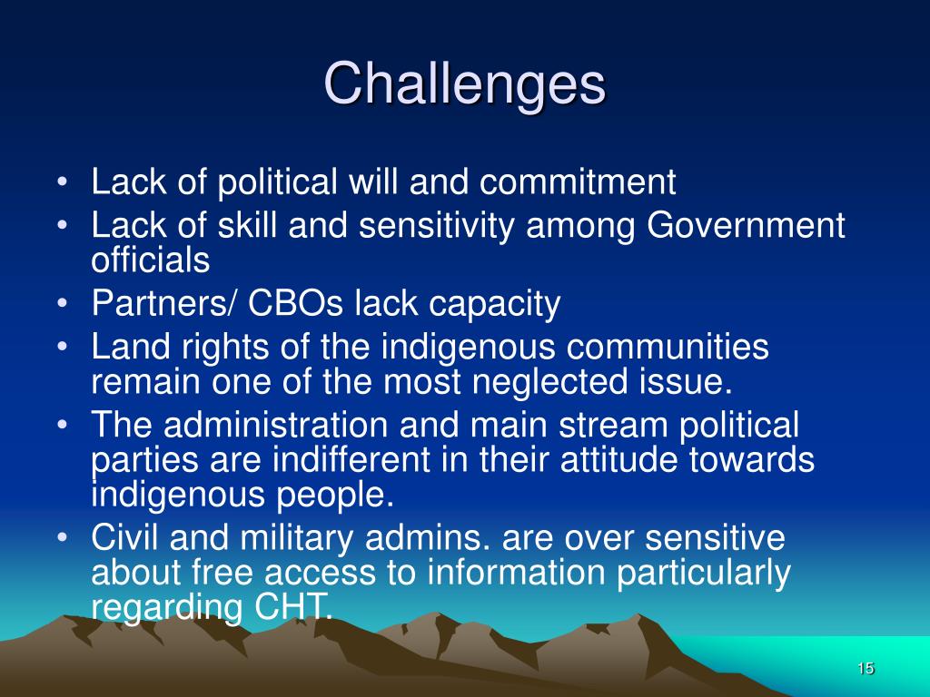 Challenges • Lack of political will and commitment • Lack of skill and sensitivity among Government officials • Partners/ CBOs lack capacity • Land rights of the indigenous communities remain one of the most neglected issue. • The administration and main stream political parties are indifferent in their attitude towards indigenous people. • Civil and military admins. are over sensitive about free access to information particularly regarding CHT.