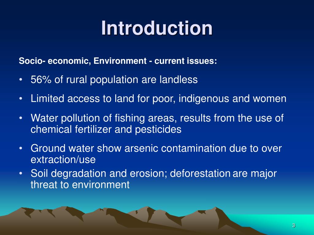 Introduction Socio- economic, Environment - current issues: • 56% of rural population are landless • Limited access to land for poor, indigenous and women • Water pollution of fishing areas, results from the use of chemical fertilizer and pesticides • Ground water show arsenic contamination due to over extraction/use • Soil degradation and erosion; deforestationare major threat to environment