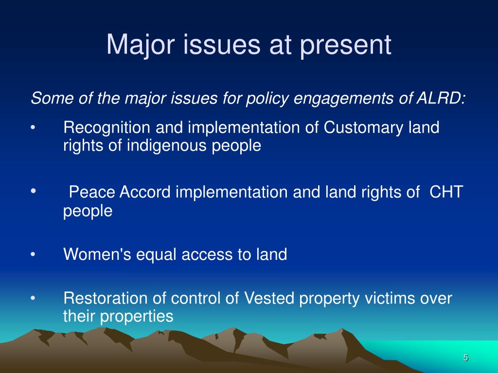 Major issues at present Some of the major issues for policy engagements of ALRD: • Recognition and implementation of Customary land rights of indigenous people • Peace Accord implementation and land rights of CHT people • Women's equal access to land • Restoration of control of Vested property victims over their properties
