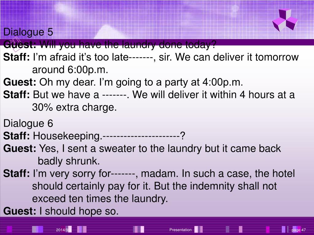 Dialogue 1 Explaining Laundry Service Hours • Context: A guest wants to have her laundry done. She • calls the housekeeping to ask about this service, • Pre-listening questions: • What are the laundry service hours ? • What is the guest worried about ? Guest: Hello. Is this Housekeeping? Staff: Yes. Sherry speaking. How may I help you?