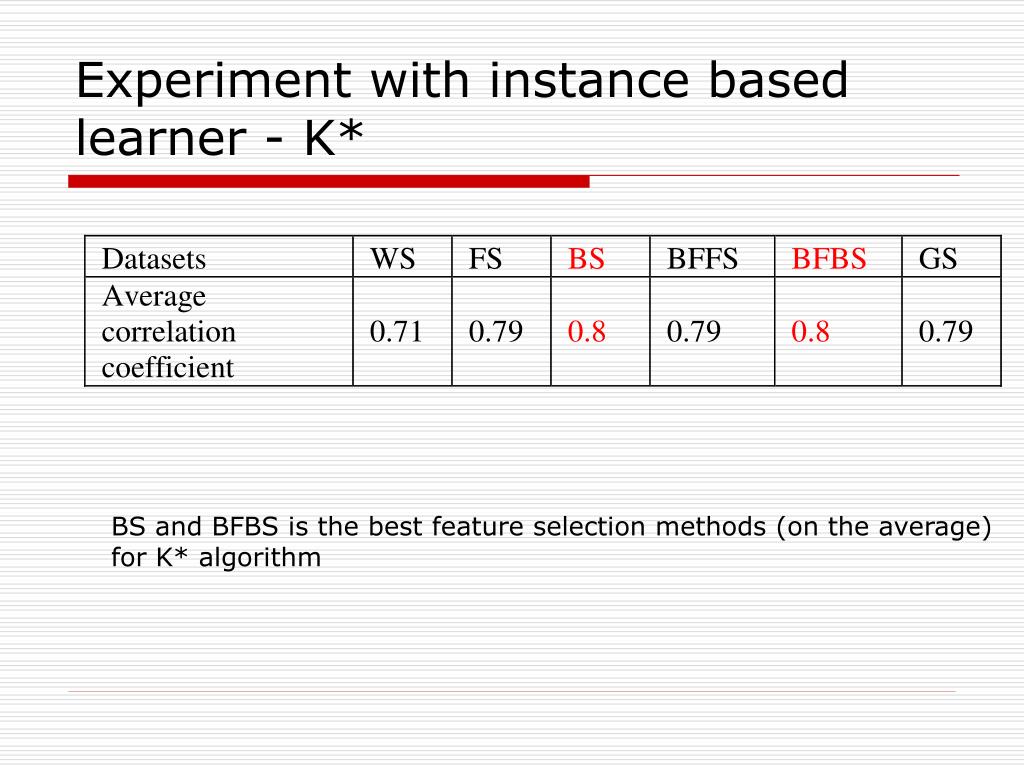 Experiment with instance based learner - K* BS and BFBS is the best feature selection methods (on the average) for K* algorithm