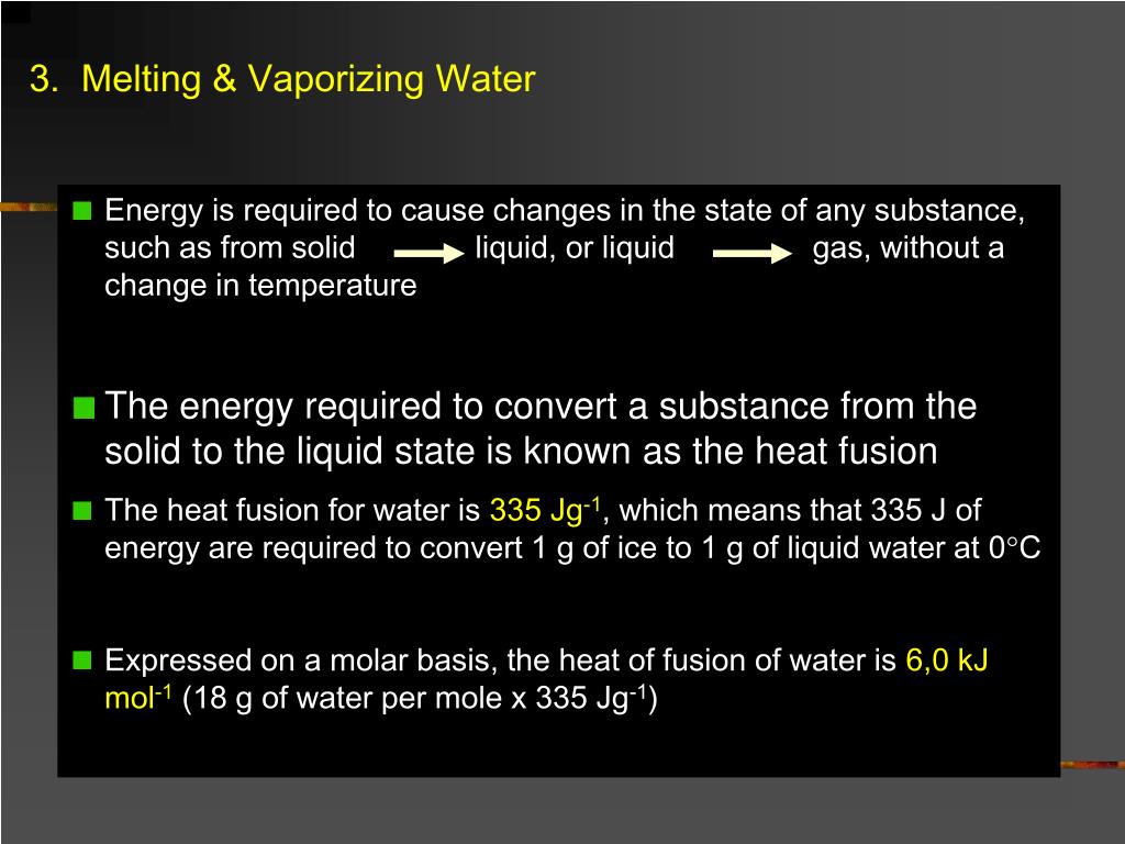 3. Melting & Vaporizing Water • Energy is required to cause changes in the state of any substance, such as from solid liquid, or liquid gas, without a change in temperature • The energy required to convert a substance from the solid to the liquid state is known as the heat fusion • The heat fusion for water is 335 Jg-1, which means that 335 J of energy are required to convert 1 g of ice to 1 g of liquid water at 0°C • Expressed on a molar basis, the heat of fusion of water is 6,0 kJ mol-1 (18 g of water per mole x 335 Jg-1)